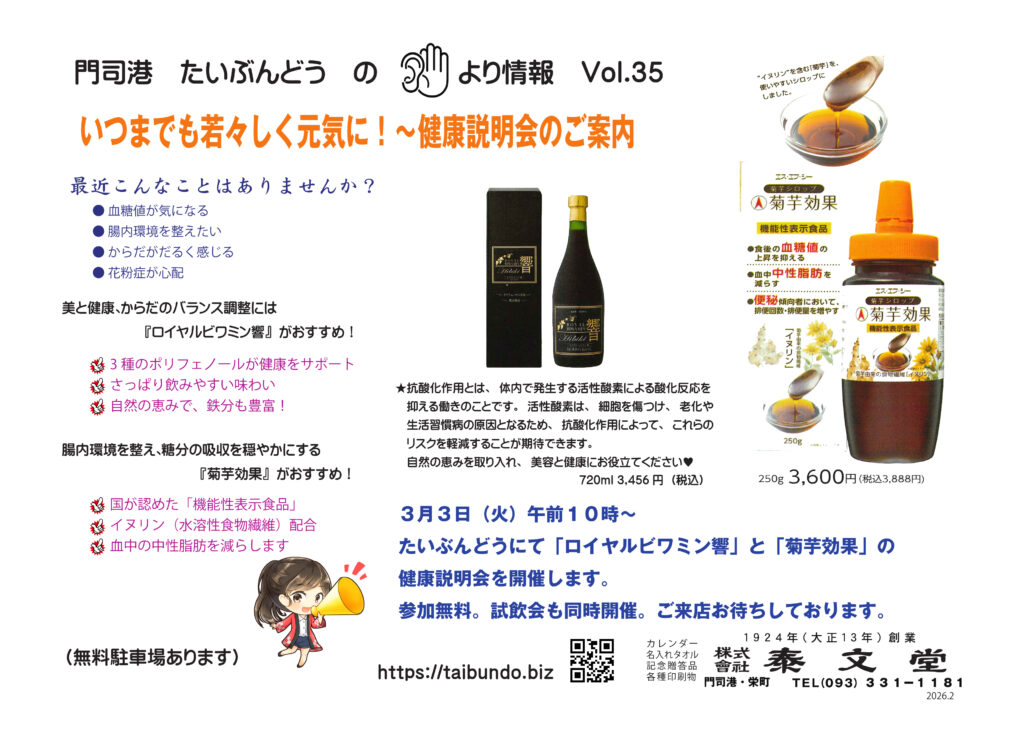 健康説明会第2弾のご案内です。3月3日(火)午前10時より、健康によいと評判の国産米のお酢とぶどう酢を主原料に、びわ葉エキス・ローヤルゼリーなどをブレンドした「ビワミン」、さらに3種のポリフェノールを追加した「ロイヤルビワミン響」、糖質制御・中性脂肪減少に効果の期待できる「菊芋効果」などの健康食材について、これらがなぜ健康によいのか、分かりやすくご説明します!年齢によるお悩み、疲れやすい、肩こりなど健康にお悩みの方、家族の健康をお考えの方、お気軽にお越し下さい。参加無料です。試飲会も開催致します。